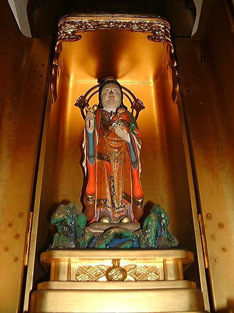 正面に日蓮大聖人。その後ろに大曼荼羅御本尊。手前に八幡菩薩